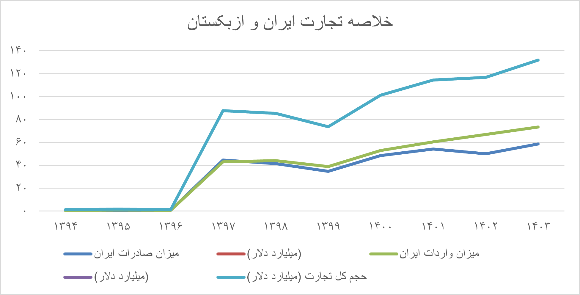 | مجموع کل تجارت ایران با ازبکستان | 132 میلیارد دلار | 13 درصد (افزایش) |
