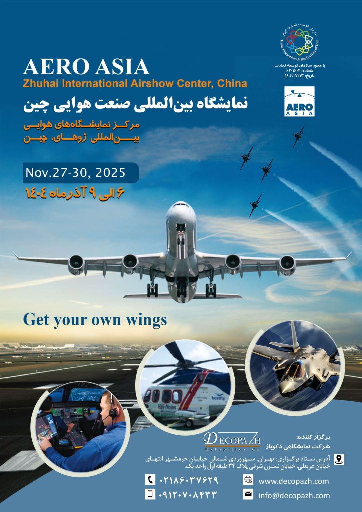 سازمان توسعه تجارت ایران مجوز برگزاری پاویون جمهوری اسلامی ایران در نمایشگاه بینالمللی صنعت هوایی ژوهای – چین را صادر نموده است.این پاویون با مدیریت شرکت کاویان ویرا پارس دکوپاژ برگزار میشود و فرصت مناسبی برای معرفی توانمندیهای صنعتی، فناوریهای هوایی و خدمات تخصصی ایران در سطح بینالمللی فراهم میآورد.