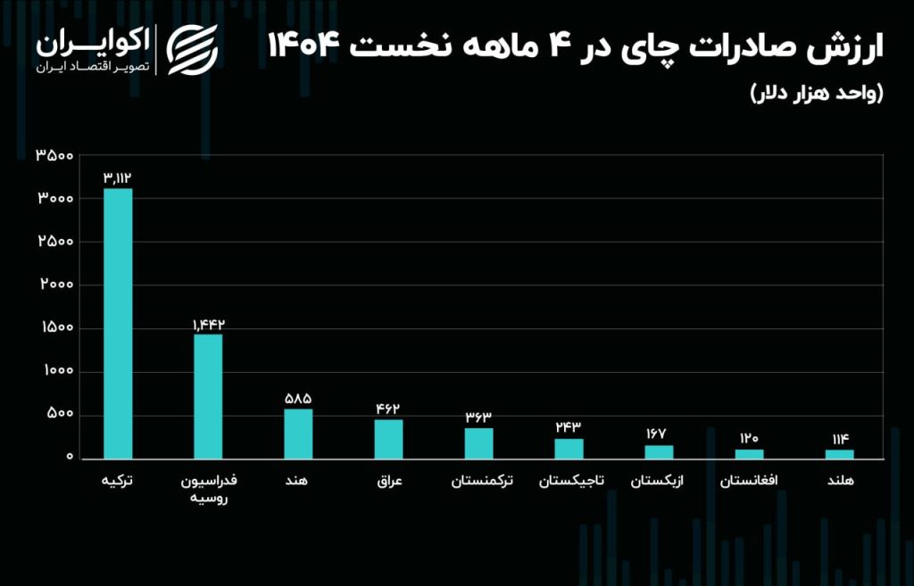 بر اساس دادههای اعلام شده از سوی گمرک در چهار ماه منتهی به تیر سال جاری چای ایرانی در مجموع به 24 کشور صادر شده که این امر از افزایش تقاضا برای این نوشیدنی محبوب حکایت دارد. ارزیابیها نشان میدهد «ترکیه»، «فدراسیون روسیه»، «هند»، «عراق»، «ترکمنستان»، «تاجیکستان»، «ازبکستان»، «افغانستان»، «هلند» و «جمهوری آذربایجان» 10 مقصد اصلی صادراتی چایی ایران به لحاظ ارزشی محسوب میشوند.