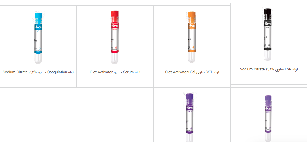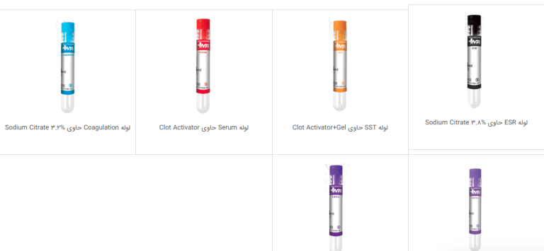 لوله خونگیری بدون خلا لوله خونگیری با خلا لوله Serum حاوی Clot Activator لوله Glucose حاوی NaF لوله SST (دارای ژل + فعالکننده لخته) لوله Coagulation با سدیم سیترات لوله ESR با سدیم سیترات لوله EDT(انواع ضدانعقاد) لوله Heparin (لیتیوم) لولهPST (لیتیوم + ژل)